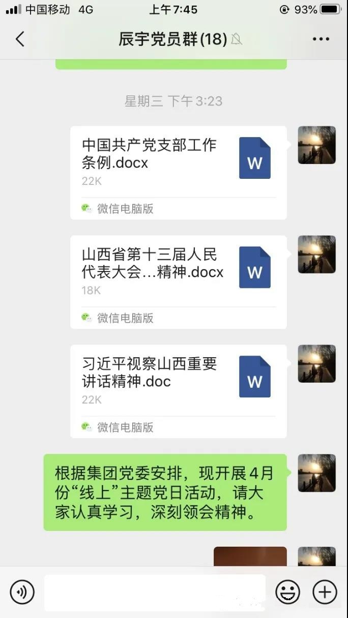 此次活動為線上學習,黨支部統(tǒng)一將《中國共產(chǎn)黨支部工作條例(試行)》《山西省第十三屆人民代表大會第三次會議精神》等學習資料發(fā)送至QQ群,要求全體黨員和入黨積極分子認真學習,深刻領會。通過此次主題黨日活動,大家紛紛表示要時刻用黨員標準嚴格要求自己,立足崗位、奮發(fā)有為,為更好地建設辰宇公司貢獻力量。
