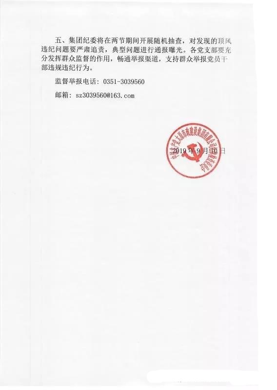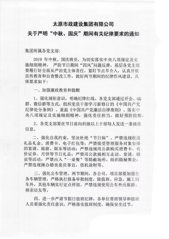 太原市政建設(shè)集團有限公司關(guān)于嚴(yán)明“中秋、國慶”期間有關(guān)紀(jì)律要求的通知