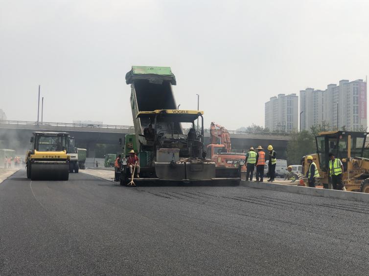 面對(duì)工期緊、任務(wù)重等情況,項(xiàng)目部不等不靠、見(jiàn)縫插針,緊抓一切施工有利時(shí)機(jī),快速推進(jìn)該工程?hào)|段道路下面層和中層瀝青混凝土鋪設(shè)作業(yè)。由于瀝青攤鋪施工受到雨水天氣、環(huán)保管理等因素影響,項(xiàng)目部結(jié)合實(shí)際組織施工,狠抓現(xiàn)場(chǎng)管理和過(guò)程控制,確保施工質(zhì)量、進(jìn)度等各項(xiàng)工作處于時(shí)刻受控狀態(tài)。施工中,項(xiàng)目部超前部署、提前著手,調(diào)配攤鋪機(jī)、壓路機(jī)、運(yùn)料車等機(jī)械,做好各項(xiàng)準(zhǔn)備工作,并要求施工人員嚴(yán)格把關(guān)各道工序,協(xié)調(diào)推進(jìn)攤鋪進(jìn)展;施工人員緊盯現(xiàn)場(chǎng),全程跟進(jìn)攤鋪過(guò)程,確保整體攤鋪質(zhì)量。同時(shí)在該工程的西段施工現(xiàn)場(chǎng),管線施工、路基平整、路側(cè)石砌筑等工序在作業(yè)面同時(shí)開展,有效壓縮工序間的銜接時(shí)間;在管線施工中,項(xiàng)目部重點(diǎn)部署溝槽回填施工,嚴(yán)格保障回填質(zhì)量達(dá)到規(guī)范要求。