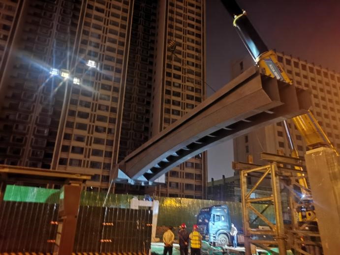 十項(xiàng)目部承建了北中環(huán)森林公園南門(mén)、濱河西路市圖書(shū)館北側(cè)、濱河西路三給街口共3座人行天橋。在北中環(huán)森林公園南門(mén)人行天橋的施工中,項(xiàng)目部結(jié)合橋梁跨度過(guò)大,北中環(huán)街車(chē)流量大等實(shí)際,組織全體參建人員加班加點(diǎn),24小時(shí)不停作業(yè),并合理安排夜間施工段進(jìn)行鋼箱梁吊裝工作。吊裝過(guò)程中,施工人員緊盯現(xiàn)場(chǎng),嚴(yán)格控制主橋軸線(xiàn)位置漂移量及臨時(shí)支架的搭設(shè)高度,保證每段鋼箱梁焊縫按規(guī)范要求進(jìn)行。同時(shí),在封路期間項(xiàng)目部提前與周邊小區(qū)物業(yè)進(jìn)行溝通,并安排專(zhuān)人在現(xiàn)場(chǎng)進(jìn)行疏導(dǎo),保證施工安全順利實(shí)施,用時(shí)3個(gè)晚上完成鋼箱梁吊裝工作,盡量減小對(duì)周邊居民的出行影響。截至目前,北中環(huán)森林公園南門(mén)人行天橋、濱河西路市圖書(shū)館北側(cè)人行天橋、濱河西路三給街口人行天橋主橋鋼箱梁已全部吊裝完成。三座天橋正在進(jìn)行主橋鋼箱梁焊接及梯坡道吊裝、護(hù)欄安裝、橋面鋪裝,恢復(fù)非機(jī)動(dòng)車(chē)道路面及人行道結(jié)構(gòu)等工作。