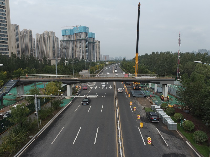 十項目部承建的北中環(huán)森林公園人行天橋主橋長度為93.8米,必須進行分段吊裝。10月8日,項目部協(xié)調多臺500噸吊車進場,在不影響車輛正常通行的情況下,利用夜間時間加緊進行吊裝。同時,因時間緊,任務重,在灌注樁施工中,項目部全體參建人員精心配合、各司其職,人材機各方面緊密配合,確保按計劃時間節(jié)點完成每日工作量,為日后主橋吊裝作業(yè)節(jié)省出更多寶貴時間。截至目前,承建的三座人行天橋鋼箱梁主體結構已全部完成。北中環(huán)森林公園南門人行天橋兩側欄桿安裝和主橋大理石鋪裝已完成,正在進行南北兩側梯道坡道欄桿安裝和大理石鋪裝;濱河西路市圖書館北側人行天橋西側坡道吊裝已完成,下一步將進行東側坡道吊裝、橋面鋪裝及護欄安裝;濱河西路三給街口人行天橋兩側梯坡道已吊裝完成,下一步將進行梯坡道安裝和主橋大理石鋪裝。