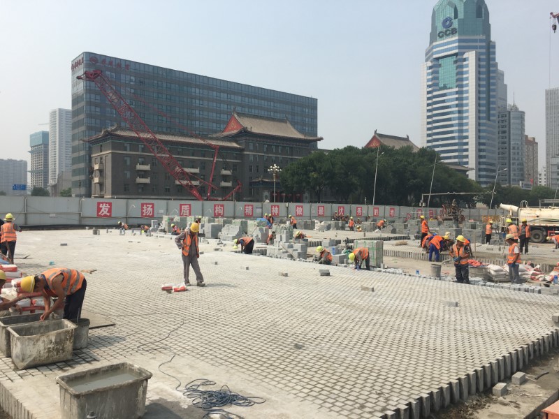 太原市五一廣場(chǎng)改造工程市政道路及管網(wǎng)工程包括環(huán)五一廣場(chǎng)一周的廣場(chǎng)西路、廣場(chǎng)環(huán)路、廣場(chǎng)東路、廣場(chǎng)南路、迎澤南街、并州北路及廣場(chǎng)范圍內(nèi)迎澤大街段道路改造,道路全長(zhǎng)1.267公里,于2021年4月開(kāi)工建設(shè),由二公司負(fù)責(zé)承建。該工程經(jīng)歷了近6個(gè)月的日夜鏖戰(zhàn),于2021年10月1日?qǐng)A滿完成了廣場(chǎng)周邊7條道路共35165平方米的道路建設(shè)任務(wù),在集團(tuán)公司施工史上創(chuàng)造了兩個(gè)“第一次”。其中,扇形花崗巖丁石鋪裝在集團(tuán)公司施工中實(shí)屬首次,整個(gè)路面是由10厘米×10厘米×30厘米的花崗巖丁石鋪設(shè)而成。整個(gè)路面鋪筑由扇形面和方形面組成,整個(gè)工程扇形鋪裝面積達(dá)到19382平方米,而一個(gè)扇形面需要88塊花崗巖丁石,且其中有18塊需要進(jìn)行切割,一個(gè)扇形面鋪裝需要經(jīng)過(guò)測(cè)量放樣、丁石試拼、切割等十幾道工序,且在花崗巖丁石下側(cè)采用了總厚度達(dá)0.98米的道路結(jié)構(gòu)層,極大程度上確保了鋪裝結(jié)構(gòu)的穩(wěn)定性和平整性。同時(shí),為確保工程順利完工,項(xiàng)目部投入大量的人力資源,并優(yōu)先選用工作細(xì)致、水平較高、技術(shù)熟練的施工隊(duì)伍,確保項(xiàng)目鋪裝進(jìn)度和質(zhì)量。項(xiàng)目部每天在1.1萬(wàn)平方米的施工場(chǎng)地上投入250余名民建隊(duì)員進(jìn)行花崗巖丁石鋪裝,同時(shí)每個(gè)隊(duì)伍按照放線-切割-安裝-灌漿-打磨的施工細(xì)節(jié),實(shí)行“小團(tuán)隊(duì)—流水線”作業(yè),確保了扇形面積的鋪裝進(jìn)度和質(zhì)量。在當(dāng)時(shí)工程即將完工之際,二公司更是從各項(xiàng)目部抽調(diào)技術(shù)骨干和民建隊(duì)員,全部投入到廣場(chǎng)最后沖刺,最終實(shí)現(xiàn)了五一廣場(chǎng)周邊道路的順利通車。