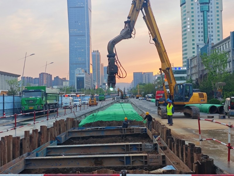 “追求精細極致,鑄就基坑支護的穩(wěn)固防線”。項目部將鋼板樁施打質(zhì)量視為確?;影踩c質(zhì)量的關(guān)鍵環(huán)節(jié),嚴格執(zhí)行材料準入制度,所有進場鋼板樁均經(jīng)過材質(zhì)證明核查、尺寸精度測量和外觀質(zhì)量檢驗三重把關(guān),確保樁身無裂紋、無銹蝕等質(zhì)量缺陷,從源頭上杜絕不合格材料。施工中,施工人員采用全站儀進行動態(tài)監(jiān)測,嚴格控制樁身垂直度偏差在規(guī)定范圍內(nèi),詳細記錄每根樁的打入深度、貫入度等關(guān)鍵參數(shù)。拔樁階段采用專用施工設(shè)備,按照“先支后拆、分段拔除”的原則有序進行,拔樁后出現(xiàn)的孔隙立即灌砂,最大限度減少對周邊土體的擾動,實現(xiàn)平穩(wěn)施工與環(huán)境保護的和諧統(tǒng)一。