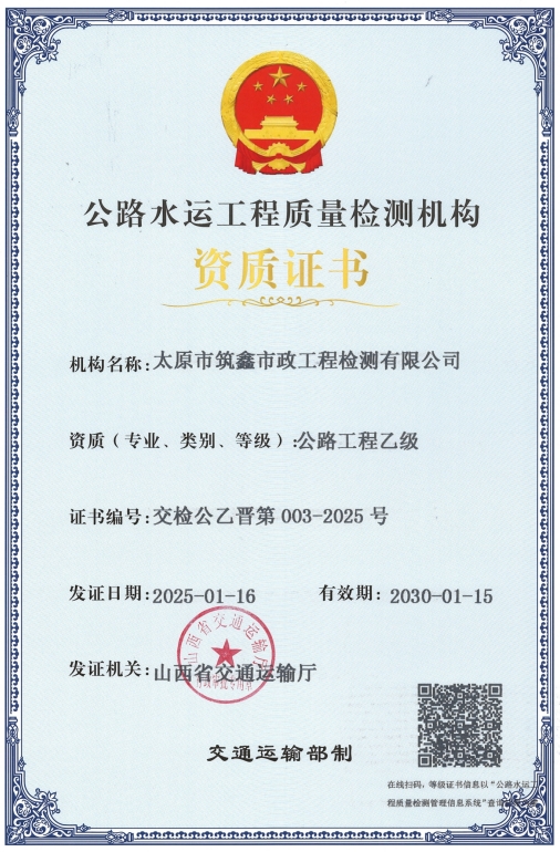 近日,筑鑫公司成功獲得公路水運工程質(zhì)量檢測機構“公路工程乙級”資質(zhì)證書。此次資質(zhì)升級,不僅是對筑鑫公司在公路工程檢測領域?qū)I(yè)實力的有力證明,更是其實現(xiàn)跨領域發(fā)展的重要里程碑,意味著下一步能夠為公路工程建設提供更多維度、更具專業(yè)性與精準度的檢測服務。
