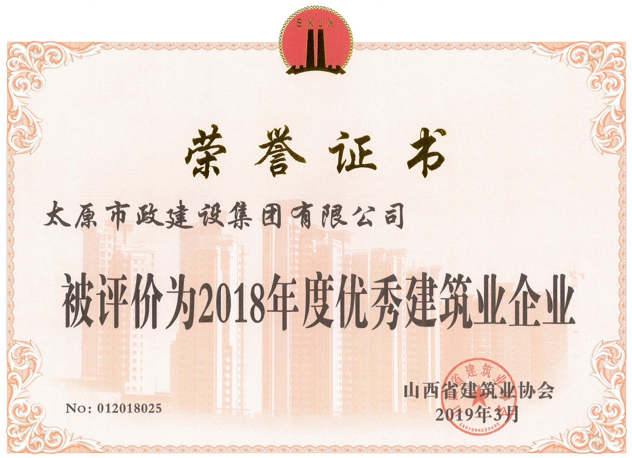 4月19日,太原市政建設集團有限公司被山西省建筑業(yè)協(xié)會評價為2018年度建筑業(yè)企業(yè)優(yōu)秀等級。
