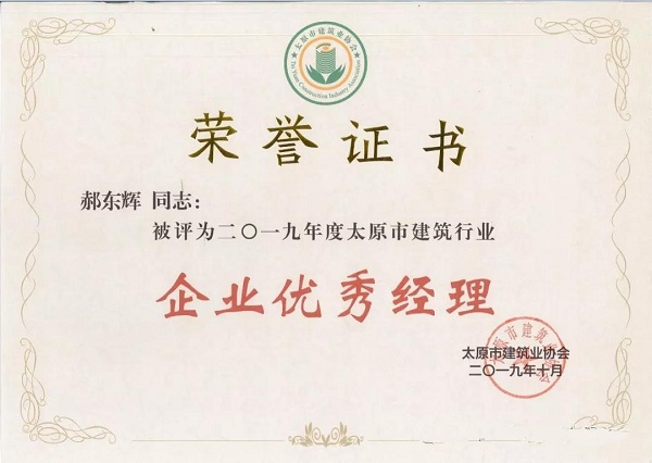 集團(tuán)公司黨委書記、董事長郝東輝榮獲“2019年度太原市建筑行業(yè)企業(yè)優(yōu)秀經(jīng)理”榮譽(yù)稱號。