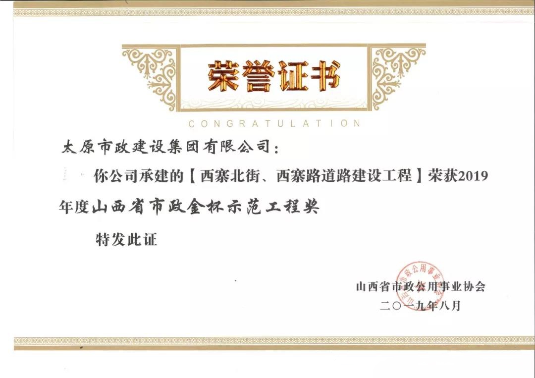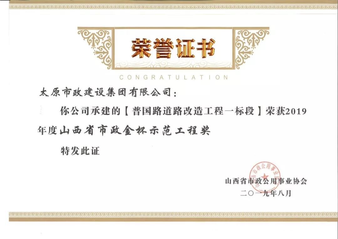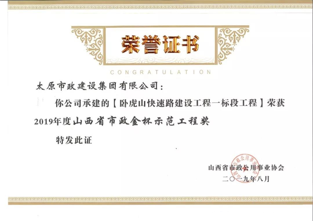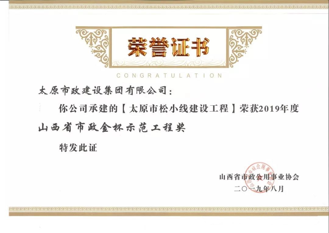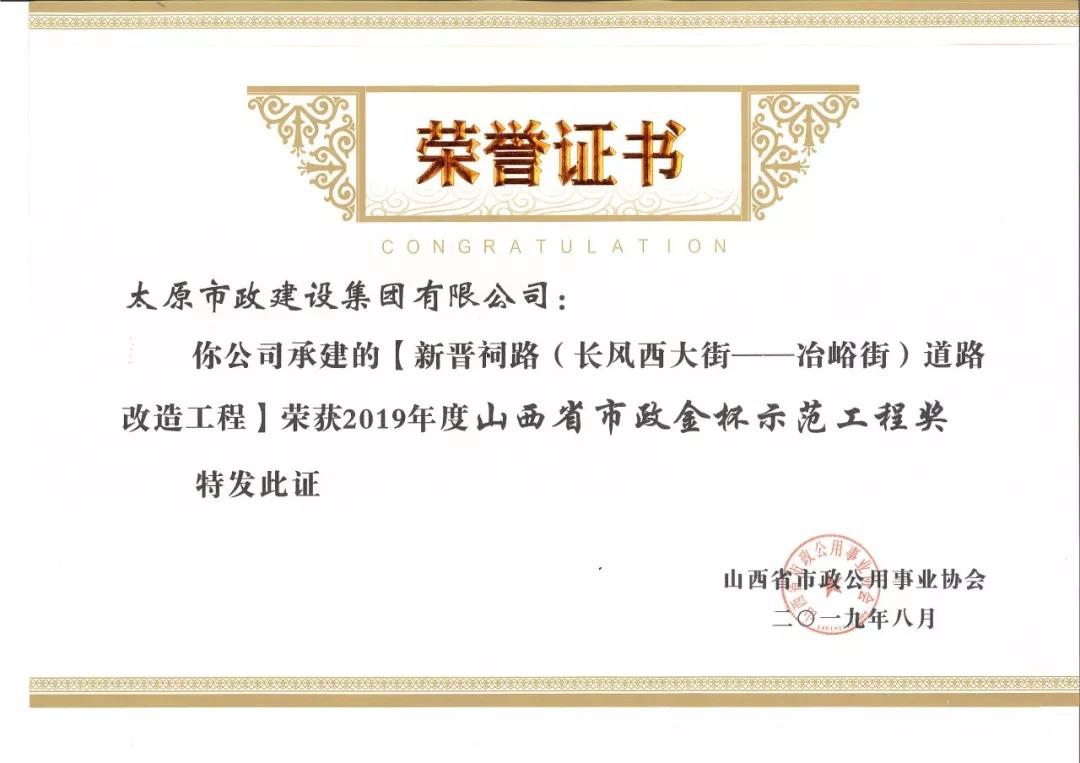 近日,太原市政建設集團有限公司承建的太原市松小線建設工程,新晉祠路(長風西大街-冶峪街)道路改造工程,臥虎山快速路建設工程一標段工程,普國路道路改造工程一標段,西寨北街、西寨路道路建設工程榮獲山西省市政公用事業(yè)協(xié)會頒發(fā)的2019年度“山西省市政金杯示范工程”榮譽稱號。集團公司王愛蓮、劉桂英、李瑞金、閆玲、王根和榮獲2019年度“山西市政工程優(yōu)秀項目經(jīng)理”榮譽稱號。