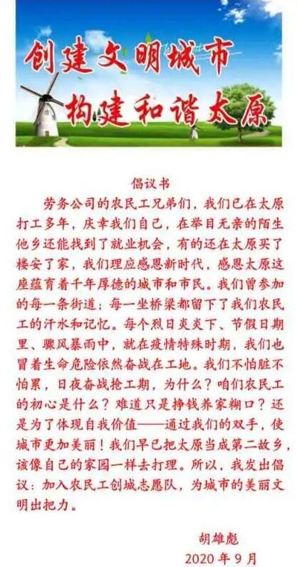 自太原市開展創(chuàng)城活動(dòng)以來(lái),太原市政集團(tuán)聚興勞務(wù)公司農(nóng)民工、全國(guó)五一勞動(dòng)獎(jiǎng)?wù)芦@得者胡雄彪第一時(shí)間向集團(tuán)公司3600余名農(nóng)民工發(fā)出倡議,鼓勵(lì)大家加入并組建一支農(nóng)民工志愿服務(wù)隊(duì),為太原創(chuàng)建全國(guó)文明城市出把力。