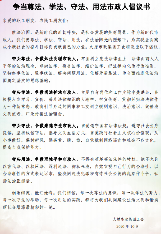 活動(dòng)中,律師事務(wù)所的5名律師現(xiàn)場為職工、農(nóng)民工進(jìn)行了法律宣傳和咨詢。集團(tuán)公司工會(huì)工作人員為大家發(fā)放了《爭當(dāng)尊法、學(xué)法、守法、用法市政人倡議書》、法律宣傳資料以及活動(dòng)紀(jì)念品。同時(shí),參加活動(dòng)的職工和農(nóng)民工在2020年“尊法守法 攜手筑夢(mèng)”服務(wù)農(nóng)民工法制宣傳行動(dòng)條幅上簽名。