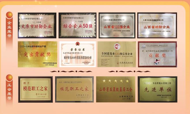 2019年,太原市政集團先后被評為全國優(yōu)秀施工企業(yè)、中國施工企業(yè)管理協(xié)會AAA級信用企業(yè)、山西省百強企業(yè)(第39位)、省骨干建筑業(yè)企業(yè)、省市優(yōu)秀建筑業(yè)企業(yè)、太原市企業(yè)50強(第25位)、太原市功勛企業(yè),獲得太原市建筑業(yè)產(chǎn)值突出貢獻獎、第二屆全國青年運動會組織籌辦工作貢獻獎等。太原市政集團承建的太原市松小線建設(shè)工程、新晉祠路道路改造工程、臥虎山快速路建設(shè)工程一標(biāo)段、普國路道路改造工程一標(biāo)段、西寨北街、西寨路道路建設(shè)工程獲得2019年度全省市政金杯示范工程獎……